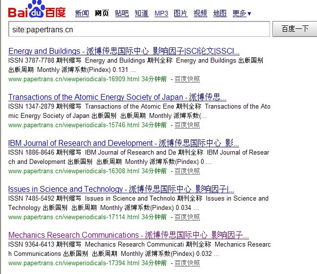 經(jīng)過近三年的開發(fā),本站已經(jīng)建議起全球最全的SCI期刊發(fā)表,投稿,審稿,影響因子等數(shù)據(jù)庫查詢平臺。開放后,google三天內(nèi)就已經(jīng)收錄達40000條以上。每天為本站帶來近萬IP流量。在發(fā)稿前,本站突然出現(xiàn)大量百度即時快照,派博傳思國際中心已經(jīng)打造出全球最大的中文SCI等學(xué)術(shù)期刊查詢平臺。幾個月來,每天接到百度推廣的電話,但是,站長仍是堅持不做推廣,無論如何,我們堅信,我們的站,在全球最行中,應(yīng)該是最適于用戶體驗的。我們也堅信,不做百度推廣,百度仍可以全面收錄,雖然這個過程很艱難。 |