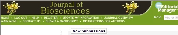 Journal of Biosciences投稿地址如下: 進(jìn)入后,出現(xiàn)如下界面。 了解一下期刊:Journal of Biosciences is a quarterly journal published by the Indian Academy of Sciences 根據(jù)派博傳思官方公司的數(shù)據(jù),Journal of Biosciences 影響因子:1.95 ;2010年總索引率:1274; 2010實(shí)驗(yàn)論文數(shù):82 ; 1.Science Citation Index (SCI) 投稿前,需注冊(cè)注號(hào),一般以通訊作者身分注冊(cè),注冊(cè)登錄后,出現(xiàn)如下目錄: 點(diǎn)擊submit new manuscript |