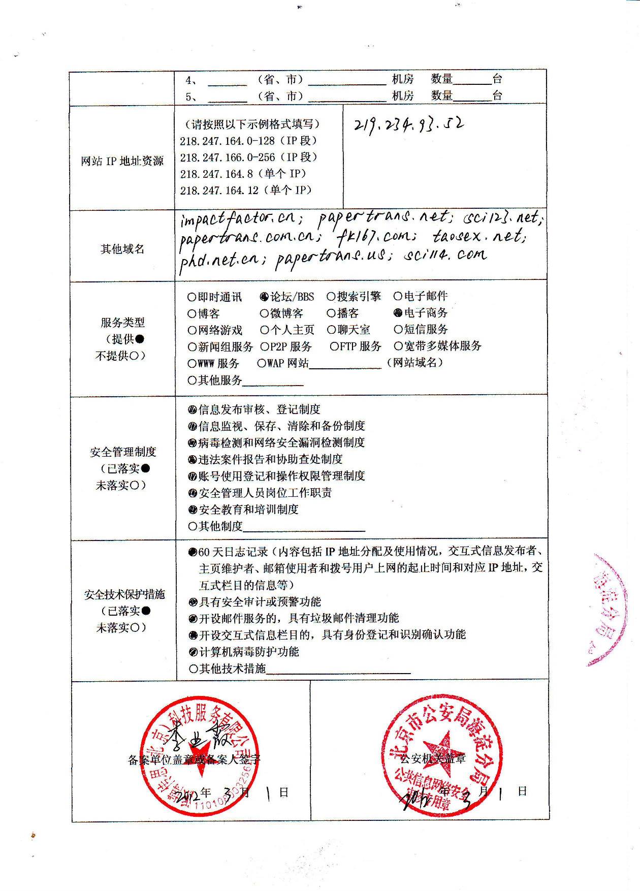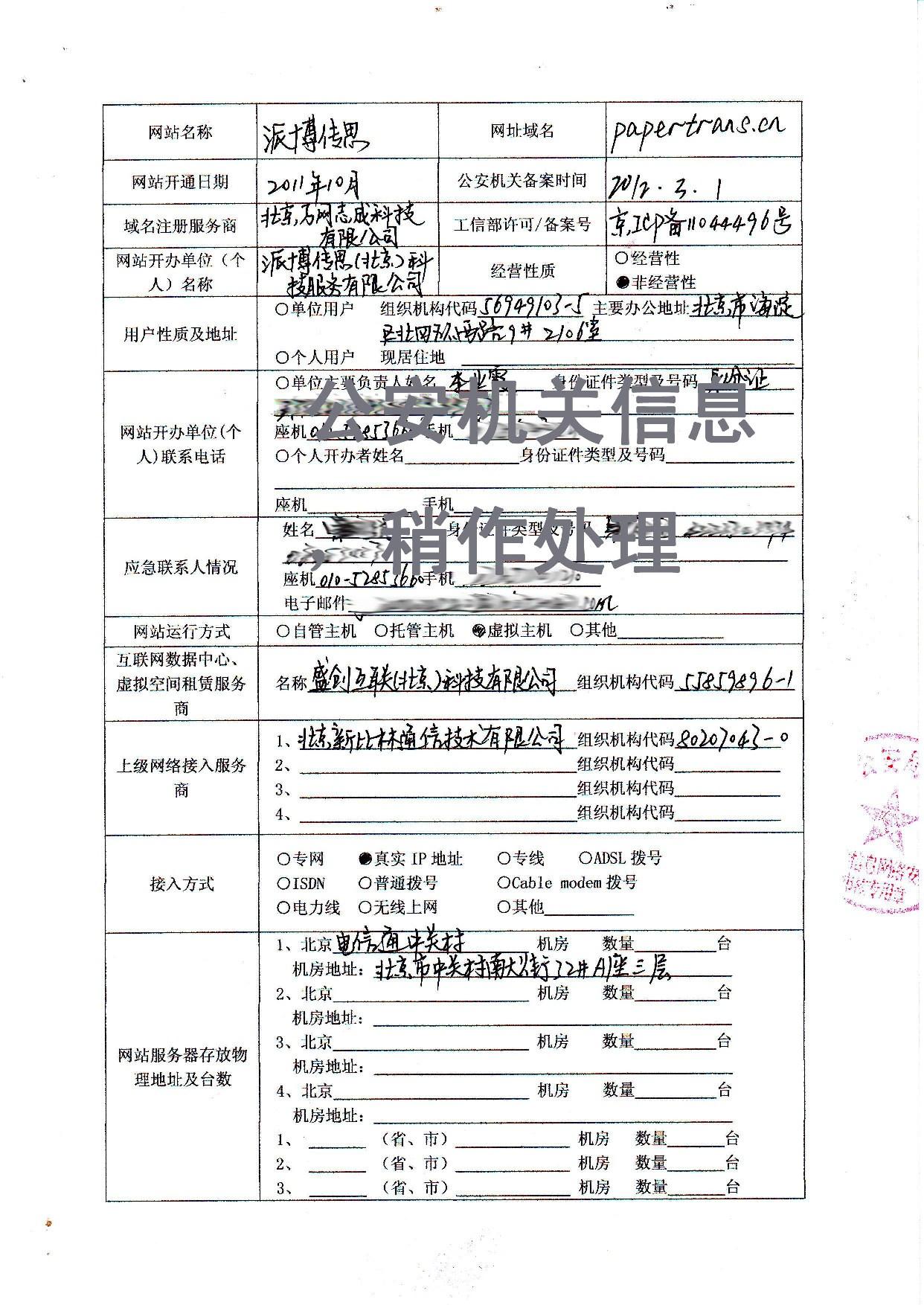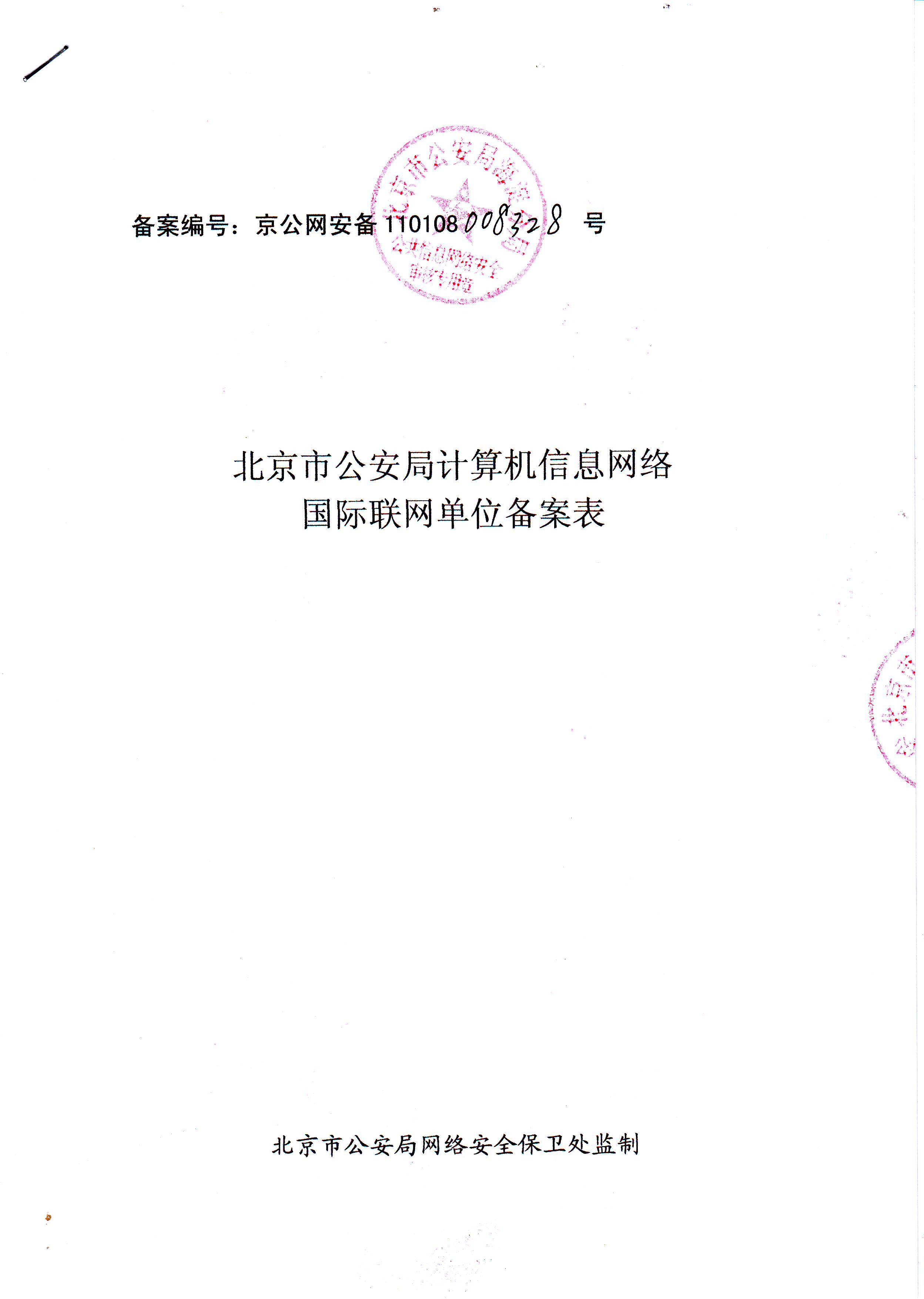 經(jīng)北京市公安局海淀分局審核通過,派博傳思(北京)科技服務(wù)有限公司網(wǎng)站,于2012年3月1日,經(jīng)驗正過備案申請,取得北京市公安局備案許可證號:京公網(wǎng)安備110108008328 。