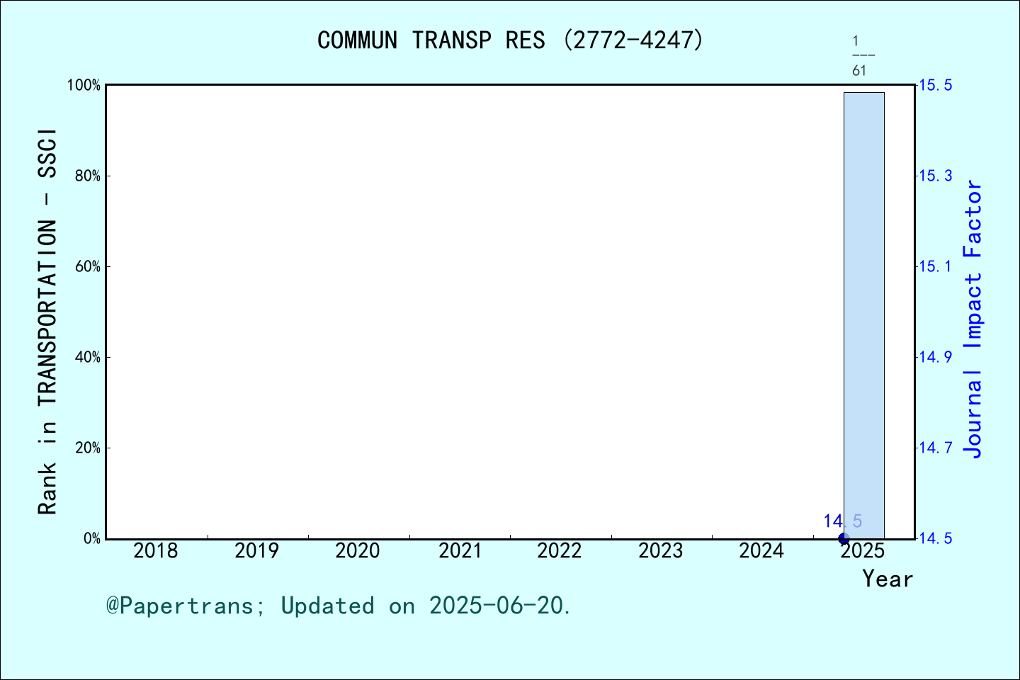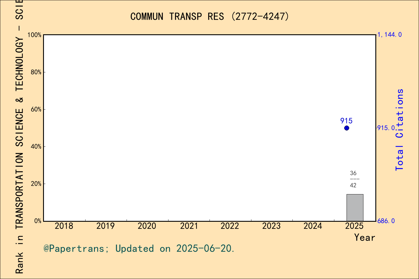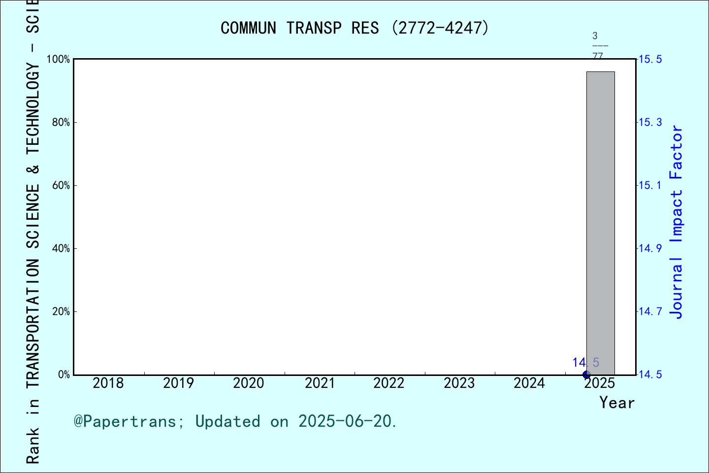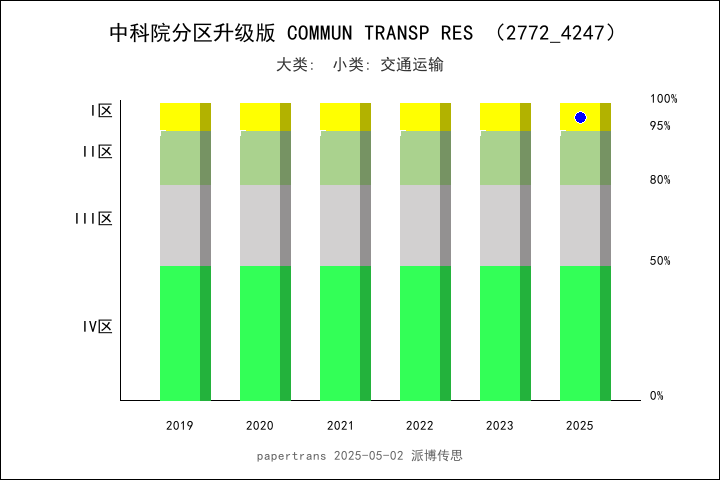根據(jù)影響因子官網(wǎng)(https://impactfactor.cn/),COMMUNICATIONS IN TRANSPORTATION RESEARCH 期刊在2021年創(chuàng)刊,2024年時(shí)間被ESCI-運(yùn)輸,ESCI-交通科技,SCIE-交通科技,SSCI-運(yùn)輸,中科院升級(jí)版(大類(lèi))-工程技術(shù),中科院升級(jí)版(小類(lèi))-運(yùn)輸科技,中科院升級(jí)版(小類(lèi))-交通運(yùn)輸,ScienceDirect(大類(lèi))-社會(huì)科學(xué),ScienceDirect(大類(lèi))-物理科學(xué),ScienceDirect(小類(lèi))-決策科學(xué),ScienceDirect(小類(lèi))-工程,ScienceDirect(小類(lèi))-社會(huì)科學(xué)等多個(gè)數(shù)據(jù)庫(kù)收錄,首年2024年影響因子12.5,最新2025年影響因子14.5,2025年獲中科院期刊分區(qū)為工程技術(shù)大類(lèi)1區(qū)Top期刊,在數(shù)據(jù)庫(kù)SSCI(社會(huì)科學(xué)索引), 專業(yè)方向: TRANSPORTATION(運(yùn)輸),期刊總數(shù):39中排名中蟬聯(lián)第一。在數(shù)據(jù)庫(kù)SCIE(自然科學(xué)索引擴(kuò)展版), 專業(yè)方向: TRANSPORTATION SCIENCE & TECHNOLOGY(交通科技),期刊總數(shù):42中排名第二位。 連續(xù)兩年在 “TRANSPORTATION” 領(lǐng)域排名第1和 “TRANSPORTATION SCIENCE & TECHNOLOGY”排名第3。期刊COMMUN TRANSP RES歷年影響因子及學(xué)科(SSCI-運(yùn)輸)排名 期刊COMMUN TRANSP RES歷年影響因子及學(xué)科(SCIE-交通科技)排名 期刊COMMUN TRANSP RES總引頻次@學(xué)科(SSCI-運(yùn)輸)排名 期刊COMMUN TRANSP RES總引頻次@學(xué)科(SCIE-交通科技)排名 首個(gè)中科院期刊分區(qū)即為工程技術(shù)大類(lèi)1區(qū)Top期刊!