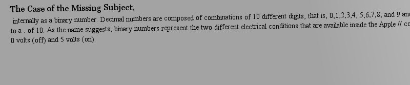 The Case of the Missing Subject, not wishing to baffle you with the wonders of modern computer science, let’s try to simplify matters somewhat and say that each instruction is stored internally as a binary number. Decimal numbers are composed of combinations of 10 different digits, that is, 0,1,2,3,4, 5,6,7,8, and 9 and are said t作者: 颶風(fēng) 時間: 2025-3-28 06:23 作者: 鋼盔 時間: 2025-3-28 13:48 作者: Obituary 時間: 2025-3-28 14:48
