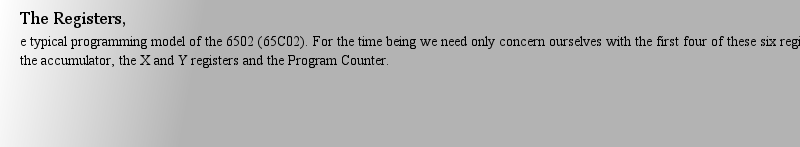 Addressing Modes II,ddressing, or indirectly from a location in zero page using . addressing. We shall now see how two byte address locations can be accessed both directly and indirectly (through the all important zero page), and how whole blocks of memory can be manipulated using .作者: 符合國情 時間: 2025-3-24 00:46