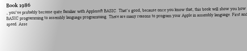 Book 1986ge. While assembly language is powerful, it doesn‘t have to be difficult to learn. In fact, if you can write programs in Applesoft BASIC, you‘re already half-way home. This book assumes you know BASIC and absolutely nothing about assembly language or machine language. Every effort has been made to w作者: achlorhydria 時間: 2025-3-23 08:13 作者: 導(dǎo)師 時間: 2025-3-23 13:11