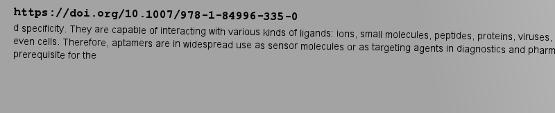 Biophysical Characterization of Aptamer-Target Interactions,d specificity. They are capable of interacting with various kinds of ligands: ions, small molecules, peptides, proteins, viruses, bacteria, and even cells. Therefore, aptamers are in widespread use as sensor molecules or as targeting agents in diagnostics and pharmaceutics. As a prerequisite for the作者: 是比賽 時(shí)間: 2025-3-24 00:05