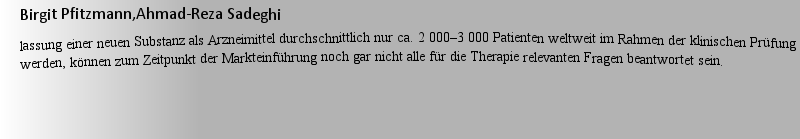 Arzneimittelforschung nach der Zulassunger Vermarktung h?ufig im Vordergrund standen und weitere Erforschung des Arzneimittels u.U. sogar behinderten. Angesichts der Tatsache, da? bis zur Zulassung einer neuen Substanz als Arzneimittel durchschnittlich nur ca. 2 000–3 000 Patienten weltweit im Rahmen der klinischen Prüfung behandelt werde作者: PANIC 時(shí)間: 2025-3-30 06:08 作者: Proclaim 時(shí)間: 2025-3-30 08:26