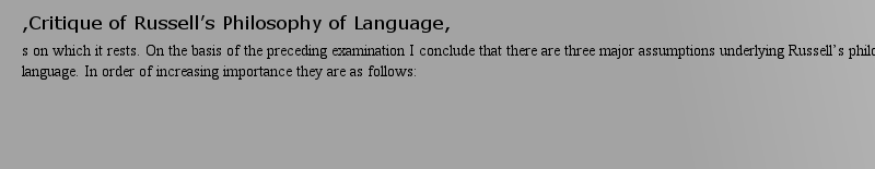 Emma E. Dutton,David R. Witherss on which it rests. On the basis of the preceding examination I conclude that there are three major assumptions underlying Russell’s philosophy of language. In order of increasing importance they are as follows:作者: Optic-Disk 時間: 2025-3-23 19:32 作者: 橢圓 時間: 2025-3-23 23:51 作者: Ankylo- 時間: 2025-3-24 05:02