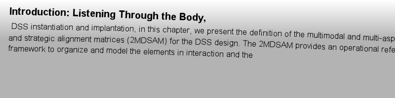 The Fields and the Definition Taken into Account for the Construction of the Multimodal and Multi-as DSS instantiation and implantation, in this chapter, we present the definition of the multimodal and multi-aspect discovery and strategic alignment matrices (2MDSAM) for the DSS design. The 2MDSAM provides an operational reference framework to organize and model the elements in interaction and the 作者: 禮節(jié) 時間: 2025-3-28 23:52