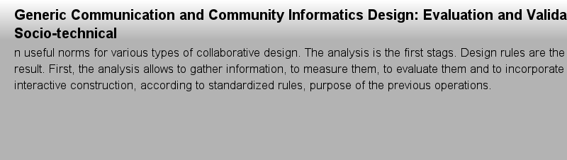Generic Communication and Community Informatics Design: Evaluation and Validation of Socio-technicaln useful norms for various types of collaborative design. The analysis is the first stags. Design rules are the synthetic result. First, the analysis allows to gather information, to measure them, to evaluate them and to incorporate them in the interactive construction, according to standardized rul作者: ascetic 時間: 2025-3-28 05:17