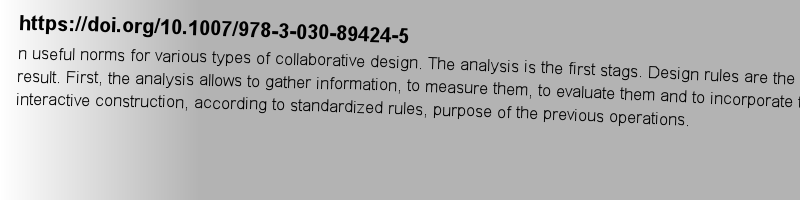 https://doi.org/10.1007/978-3-030-89424-5n useful norms for various types of collaborative design. The analysis is the first stags. Design rules are the synthetic result. First, the analysis allows to gather information, to measure them, to evaluate them and to incorporate them in the interactive construction, according to standardized rul作者: 成份 時間: 2025-3-23 12:41 作者: Longitude 時間: 2025-3-23 16:09