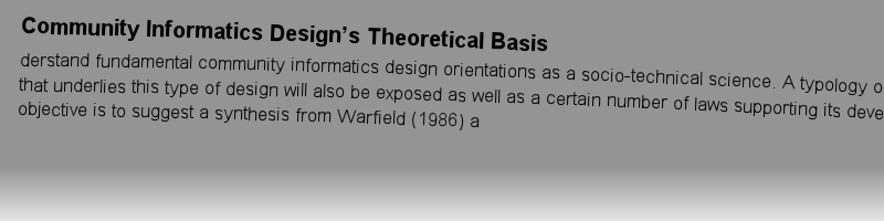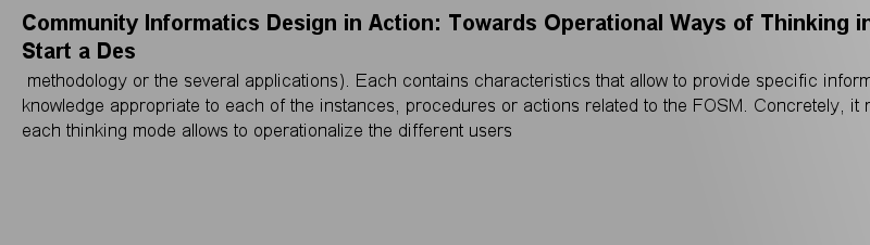 Community Informatics Design in Action: Towards Operational Ways of Thinking in Order to Start a Desion process called community informatics design. It is nothing less than an exploratory voyage through several thinking and action modes relying on transdisciplinarity. We will now see that these thinking modes are a very concrete way of operationalizing the community informatics design thinking by 作者: 一條卷發(fā) 時間: 2025-3-28 00:01