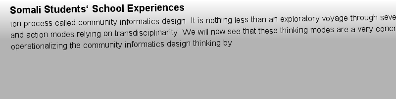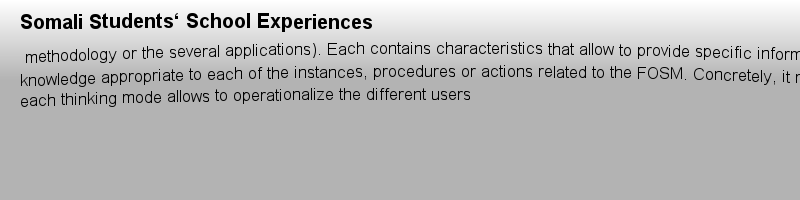 Somali Students‘ School Experiencesystems and the social science field (human-computer interaction, computer-mediatized collaborative work, Scandinavian participative design, interactive design, digital design), are limited in their perspectives, more specifically in their aptitude to represent the information and complex virtual sys作者: folliculitis 時間: 2025-3-27 03:01 作者: 怪物 時間: 2025-3-27 08:55 作者: Herd-Immunity 時間: 2025-3-27 09:36