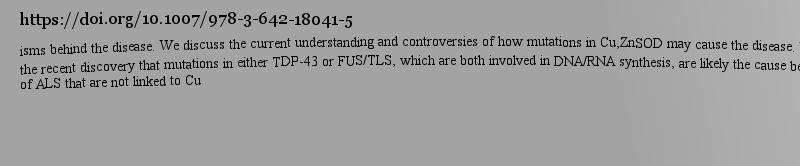 Amyotrophic Lateral Sclerosis,isms behind the disease. We discuss the current understanding and controversies of how mutations in Cu,ZnSOD may cause the disease. We also focus on the recent discovery that mutations in either TDP-43 or FUS/TLS, which are both involved in DNA/RNA synthesis, are likely the cause behind many cases of ALS that are not linked to Cu作者: Evolve 時(shí)間: 2025-3-22 20:29 作者: 土坯 時(shí)間: 2025-3-22 22:19