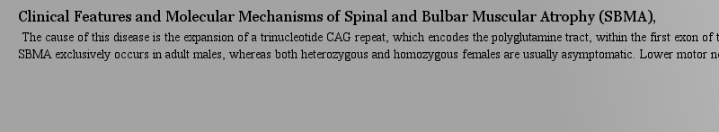 Pierre Ségur,M.-C. Bordage,M. Yousfi The cause of this disease is the expansion of a trinucleotide CAG repeat, which encodes the polyglutamine tract, within the first exon of the . (.) gene. SBMA exclusively occurs in adult males, whereas both heterozygous and homozygous females are usually asymptomatic. Lower motor neurons in the ant作者: Limerick 時(shí)間: 2025-3-27 16:46