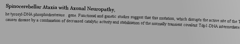 Spinocerebellar Ataxia with Axonal Neuropathy,lent reaction intermediate can form during the repair of stalled topoisomerase I-DNA adducts or oxidatively damaged bases at the 3′ end of the DNA at a strand break. However, our current understanding of the biology of Tdp1 function in humans is limited and does not allow us to fully elucidate the disease mec作者: Stagger 時(shí)間: 2025-3-23 12:23