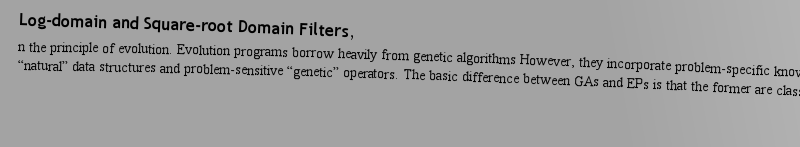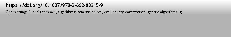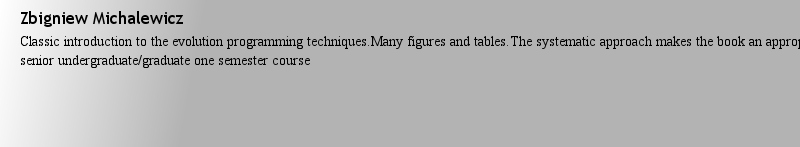 ext for a senior undergraduate/graduate one semester courseGenetic algorithms are founded upon the principle of evolution, i.e., survival of the fittest. Hence evolution programming techniques, based on genetic algorithms, are applicable to many hard optimization problems, such as optimization of fu作者: 最初 時間: 2025-3-30 20:47 作者: profligate 時間: 2025-3-31 02:41 作者: Perceive 時間: 2025-3-31 05:08 作者: 頌揚國家 時間: 2025-3-31 12:37
