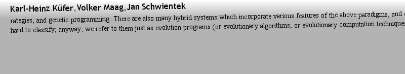 Karl-Heinz Küfer,Volker Maag,Jan Schwientekrategies, and genetic programming. There are also many hybrid systems which incorporate various features of the above paradigms, and consequently are hard to classify; anyway, we refer to them just as evolution programs (or evolutionary algorithms, or evolutionary computation techniques).作者: faddish 時間: 2025-3-27 13:59 作者: 魔鬼在游行 時間: 2025-3-27 18:50 作者: FLAT 時間: 2025-3-27 23:09 作者: Exaggerate 時間: 2025-3-28 04:56 作者: 矛盾 時間: 2025-3-28 07:16 作者: 擔憂 時間: 2025-3-28 10:40