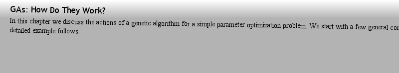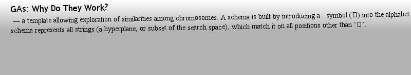 GAs: Why Do They Work? — a template allowing exploration of similarities among chromosomes. A schema is built by introducing a . symbol (?) into the alphabet of genes. A schema represents all strings (a hyperplane, or subset of the search space), which match it on all positions other than ‘?’.作者: 諷刺 時間: 2025-3-29 00:41 作者: 意外 時間: 2025-3-29 03:07 作者: oxidant 時間: 2025-3-29 09:50 作者: 自傳 時間: 2025-3-29 12:12 作者: 神圣不可 時間: 2025-3-29 17:27
