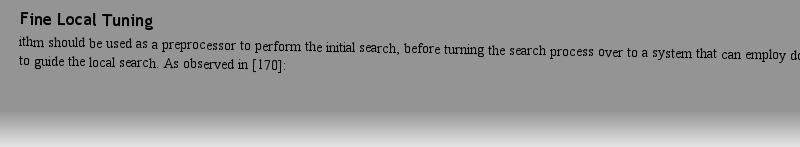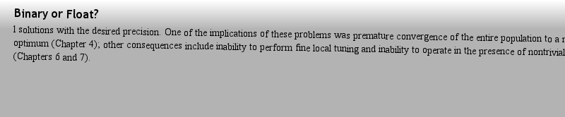 Trevor A. Thorpe,Claudio Stasollal solutions with the desired precision. One of the implications of these problems was premature convergence of the entire population to a non—global optimum (Chapter 4); other consequences include inability to perform fine local tuning and inability to operate in the presence of nontrivial constraints (Chapters 6 and 7).作者: 平息 時間: 2025-3-27 03:50 作者: 擔心 時間: 2025-3-27 08:03