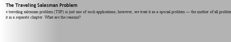 The Traveling Salesman Probleme traveling salesman problem (TSP) is just one of such applications; however, we treat it as a special problem — the mother of all problems — and discuss it in a separate chapter. What are the reasons?作者: Lyme-disease 時間: 2025-3-29 21:12