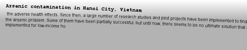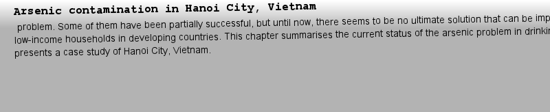 https://doi.org/10.1007/978-0-387-21753-6 problem. Some of them have been partially successful, but until now, there seems to be no ultimate solution that can be implemented for low-income households in developing countries. This chapter summarises the current status of the arsenic problem in drinking water, and presents a case study of Hanoi City, Vietnam.作者: 不可救藥 時間: 2025-3-27 22:10 作者: 青少年 時間: 2025-3-28 04:50 作者: 繁殖 時間: 2025-3-28 06:55