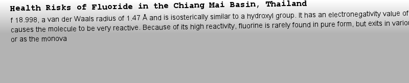 Health Risks of Fluoride in the Chiang Mai Basin, Thailandf 18.998, a van der Waals radius of 1.47 ? and is isosterically similar to a hydroxyl group. It has an electronegativity value of 4.0, which causes the molecule to be very reactive. Because of its high reactivity, fluorine is rarely found in pure form, but exits in various compounds or as the monovalent anion fluoride.作者: Anthropoid 時間: 2025-3-29 21:48