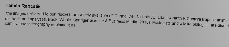 Tamás Rapcsáktion contained in these images?.In this chapter, I review some broad applications and uses of imagery for ecologists and wildlife biologists. Images can be used to (1) identify species for occurrence, (2) identify individuals for mark-recapture studies and other behavioral studies, and (3) count ind作者: 鄙視 時(shí)間: 2025-3-23 10:00 作者: 平躺 時(shí)間: 2025-3-23 14:05 作者: 薄荷醇 時(shí)間: 2025-3-23 20:04 作者: Herbivorous 時(shí)間: 2025-3-23 23:07 作者: SPURN 時(shí)間: 2025-3-24 06:14 作者: 賞錢 時(shí)間: 2025-3-24 09:02