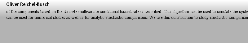 of the components based on the discrete multivariate conditional hazard rate is described. This algorithm can be used to simulate the system behavior and can be used for numerical studies as well as for analytic stochastic comparisons. We use this construction to study stochastic comparison of life 作者: 一夫一妻制 時間: 2025-3-23 11:46 作者: hypertension 時間: 2025-3-23 17:25