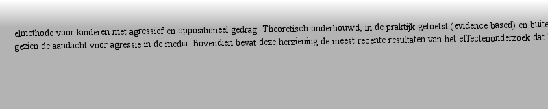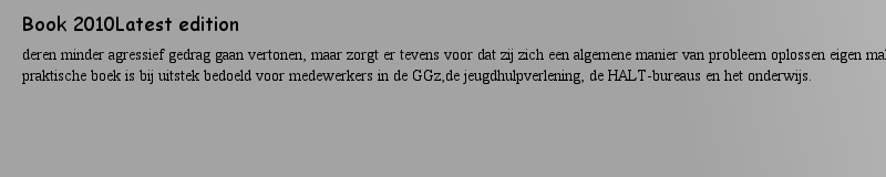 書目名稱 | Zelfcontrole | 副標(biāo)題 | Een sociaal cognitie | 編輯 | Teun Manen | 視頻video | http://file.papertrans.cn/1061/1060865/1060865.mp4 | 圖書封面 |  | 描述 | Dit boek bevat het sociaal-cognitieve interventieprogramma Zelfcontrole, het resultaat van vele jaren onderzoek naar de best passende behandelmethode voor kinderen met agressief en oppositioneel gedrag. Theoretisch onderbouwd, in de praktijk getoetst (evidence based) en buitengewoon actueel gezien de aandacht voor agressie in de media. Bovendien bevat deze herziening de meest recente resultaten van het effectenonderzoek dat Teun van Manen over agressie en oppositioneel gedrag bij kinderen heeft uitgevoerd.Zelfcontrole gaat uitgebreid in op het sturen, begeleiden en coachen van kinderen in het zich eigen maken van zelfcontrole over wat zij voelen, denken en doen. Het aanleren van zelfcontroletechnieken heeft niet alleen als doel dat deze kinderen minder agressief gedrag gaan vertonen, maar zorgt er tevens voor dat zij zich een algemene manier van probleem oplossen eigen maken.Dit praktische boek is bij uitstek bedoeld voor medewerkers in de GGz,de jeugdhulpverlening, de HALT-bureaus en het onderwijs. | 出版日期 | Book 2010Latest edition | 版次 | 2 | doi | https://doi.org/10.1007/978-90-313-7832-6 | isbn_softcover | 978-90-313-7831-9 | isbn_ebook | 978-90-313-7832-6 | copyright | Bohn Stafleu van Loghum 2010 |