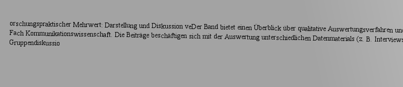 期刊全稱 | Auswertung qualitativer Daten | 期刊簡稱 | Strategien, Verfahre | 影響因子2023 | Andreas M. Scheu | 視頻video | http://file.papertrans.cn/166/165918/165918.mp4 | 發(fā)行地址 | Schlie?t eine Lücke, da die bisherige kommunikationswissenschaftliche Methodenliteratur die Auswertung qualitativer Daten nicht behandelt..Forschungspraktischer Mehrwert: Darstellung und Diskussion ve | 圖書封面 |  | 影響因子 | Der Band bietet einen überblick über qualitative Auswertungsverfahren und -strategien im Fach Kommunikationswissenschaft. Die Beitr?ge besch?ftigen sich mit der Auswertung unterschiedlichen Datenmaterials (z. B. Interviews, Gruppendiskussionen, audiovisuelle Daten), mit forschungspraktischen Herausforderungen in Quer- und L?ngsschnittstudien, mit unterschiedlichen Strategien der Datenauswertung (z. B. Typologien, Cluster, Vergleiche, Diskursanalysen, Netzwerkanalysen) sowie verschiedenen qualitativen Perspektiven; von eher induktiven Auswertungsstrategien über deduktive, theoriegeleitete Verfahren bis hin zu teilweise automatisierten Prozessen. | Pindex | Book 2018 |