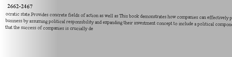 描述 | This book demonstrates how companies can effectively promote their business by assuming political responsibility and expanding their investment concept to include a political component. It shows that the success of companies is crucially dependent on socio-political conditions. In other words: politically sustainable management is a business case. Therefore companies should take a closer look at the opportunities at the interface of politics and business..To date, there has not been a satisfactory assessment of the issue of Corporate Political Responsibility (CPR), which combines a conceptual framework with practical measures for implementation. This book remedies that oversight, and shows how companies can develop the necessary attitude and operate in concrete CPR fields of action, illustrated by diagrams and examples. While doing so, the author explains how CPR is different from shere lobbying or Corporate Social Responsibility (CSR)..The author provides an overview of the public realm and its actors, and shows how, through political contributions, they can strengthen the performance of the state and thus their own performance. Companies have unique resources for doing so, and in |