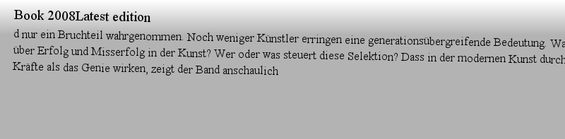 描述 | .Jede Generation bringt Künstler zum Vorschein. Jedem Meister folgen Schüler. Doch aus der Vielzahl talentierter und weniger talentierter Personen wird nur ein Bruchteil wahrgenommen. Noch weniger Künstler erringen eine generationsübergreifende Bedeutung. Was entscheidet über Erfolg und Misserfolg in der Kunst? Wer oder was steuert diese Selektion? Dass in der modernen Kunst durchaus andere Kr?fte als das Genie wirken, zeigt der Band anschaulich am Objekt und dessen Konfrontation mit evolution?ren Entwicklungsmustern. Vom Detail ausgehend wird dabei eine drei Generationen umspannende Entwicklung nachgezeichnet, die nicht weniger als die gesamte Moderne in Frage stellt. Einen Milliarden schweren Kunstmarkt als hoch spezialisiertes Nischenph?nomen zu betrachten, erscheint gewagt, aber was sind 50 Millionen britische Pfund für einen diamantbesetzten Totensch?del im Vergleich zu 3000 Jahren westlicher Kulturgeschichte? Stoff für Diskussionen wird hiermit geliefert. . |
