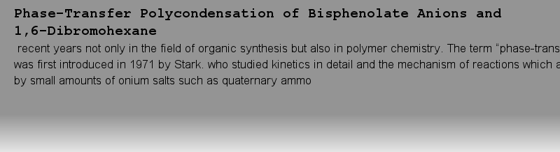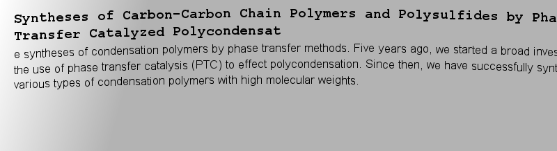 描述Phase transfer catalysis or interfacial catalysis is a syn- thetic technique involving transport of an organic or inorganic salt from a solid or aqueous phase into an organic liquid where reaction with an organic-soluble substrate takes place. Over the past 15 years there has been an enormous amount of effort invested in the development of this technique in organic synthe- sis. Several books and numerous review articles have appeared summarizing applications in which low molecular weight catalysts are employed. These generally include either crown ethers or onium salts of various kinds. While the term phase transfer catalysis is relatively new, the concept of using a phasetrans- fer agent (PTA) is much older~ Both Schnell and Morgan employed such catalysts in synthesis of polymeric species in the early 1950‘s. Present developments are really extensions of these early applications. It has only been within the last several years that the use of phase transfer processes have been employed in polymer synthesis and modification. Similarly, the use of polymer-bound phase transfer agents is also a recent development. These and related areas have nonetheless enjoyed explosive growth as mea