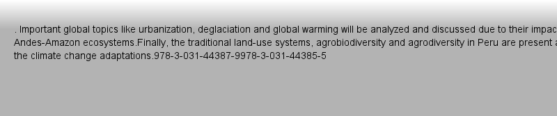 | 描述 | This book focuses on ecosystems and species adaptations in the unique Peruvian Andean-Amazonian region. The presence of the Andes as the backbone is the cause of the huge ecosystem diversity and biodiversity of species that characterize the Andean-Amazonian ecosystems. The complex orography of Peru as results of the Andes presence in its tropical setting favors the occurrence of local climatic features that provide diverse environmental conditions for multiple, unique plant and animal species, many of them endemic to the Andes. The book will introduce the reader to the climatic history and geography of the Peruvian Andes and the Peruvian Natural Areas Protection system focusing on the Manu and Northwest biosphere reserves given their relevant ecological importance as well as the relationship between them and the local population. Important global topics like urbanization, deglaciation and global warming will be analyzed and discussed due to their impact in the Andes-Amazon ecosystems.Finally, the traditional land-use systems, agrobiodiversity and agrodiversity in Peru are present and linked with the climate change adaptations. |