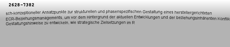| 描述 | ?Herausarbeitung der strategischen Bedeutung absatzgerichteter ECR-Kooperation sowie Entwicklung theoretisch-konzeptioneller Ansatzpunkte zur strukturellen und phasenspezifischen Gestaltung eines herstellergerichteten ECR-Beziehungsmanagements, um vor dem Hintergrund der aktuellen Entwicklungen und der beziehungsinh?renten Konflikte Gestaltungshinweise zu entwickeln, wie strategische Zielsetzungen im Rahmen von ECR-Partnerschaften realisiert werden k?nnen. |