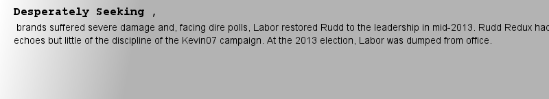 描述 | Political Branding Strategies tells the story of branding by the Australian Labor Party across seven years and three brands – Kevin07, The Real Julia and that of the party. Employing a new framework to understand and evaluate branding, the book offers lessons for practitioners, researchers and citizens in democracies everywhere. |