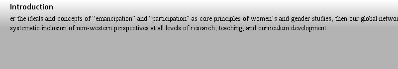書目名稱 | Societies in Transition — Challenges to Women’s and Gender Studies | 編輯 | Heike Fle?ner,Lydia Potts | 視頻video | http://file.papertrans.cn/871/870171/870171.mp4 | 叢書名稱 | Studien Interdisziplin?re Geschlechterforschung | 圖書封面 |  | 描述 | Currently, women‘ sand gen der studies programs exist in many countries around the world. It is a crucial task for the future of this still emerging disci- pline to enhance international communication and cooperation between study programs, students, scholars, activists, and professionals. If we consider the ideals and concepts of "emancipation" and "participation" as core principles of women‘ sand gen der studies, then our global networking requires system- atic inclusion of non-western perspectives at all levels of research, teaching, and curriculum development. The international conference "Societies in Transition - Challenges to Women‘s and Gender Studies," held at Carl von Ossietzky Universit?t Oldenburg, Germany, from June 28 through July 1,2001, was intended as a step in this direction, bringing together speakers - all represented in this book - from a variety of countries: Poland and Hungary, Great Britain and New Zealand, India and Nepal, South Africa, Jordan, Turkey and Yemen. Although this list might at first appear arbitrary, its composition was both carefully and intentionally constructed. As organizers, we knew that a com- paratively sm all conference could not entert | 出版日期 | Book 2002 | 關(guān)鍵詞 | AIDS; ETA; European Union (EU); IRA; Nation; development; education; gender; gender Mainstreaming; gender Stu | 版次 | 1 | doi | https://doi.org/10.1007/978-3-663-11375-1 | isbn_softcover | 978-3-8100-3529-5 | isbn_ebook | 978-3-663-11375-1 | copyright | Springer Fachmedien Wiesbaden 2002 |