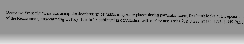 描述 | From the series examining the development of music in specific places during particular times, this book looks at European countries at the time of the Renaissance, concentrating on Italy. It is to be published in conjunction with a television series. |
